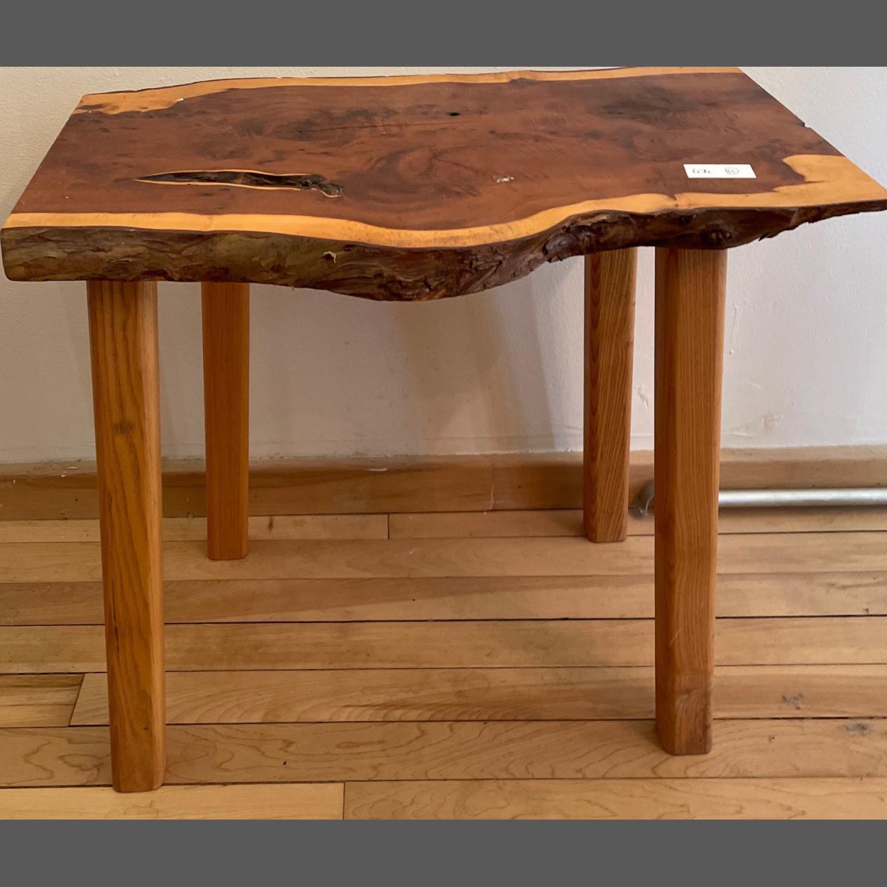HAND CARVED small coffee table with a leaf of wood sliced through for the table top