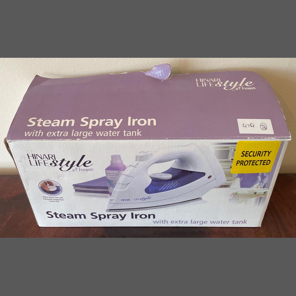 A steam spray iron still with its box