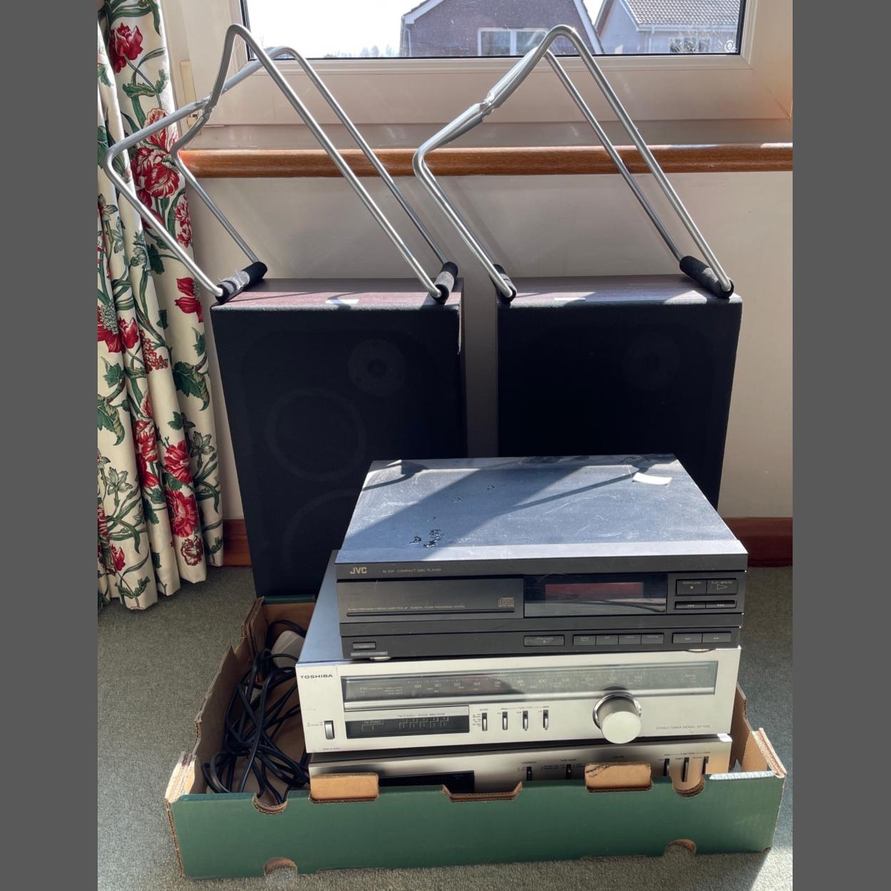 A JVC XLE31 compact disc player with two large speakers with stands and a TOSHIBA TUNER ST- T25L AND AN AMP SB-A25 with all cabling