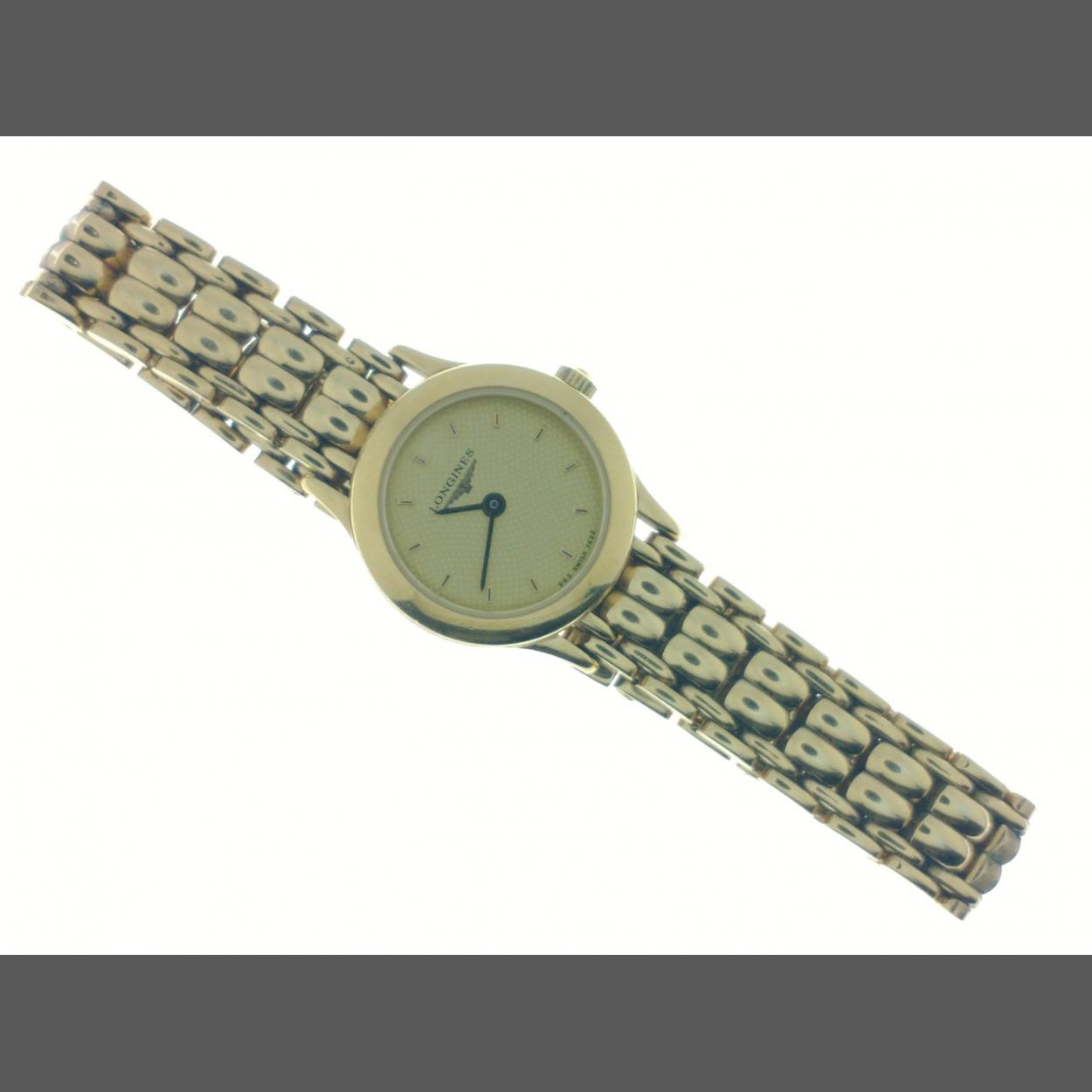 Longines gold coloured wrist watch with yellow metal strap. Face stamped 963 SWISS 7422
