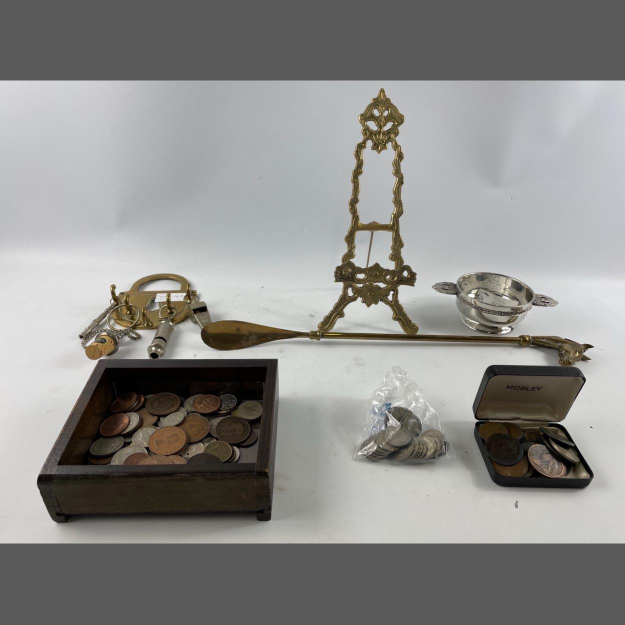 BRASS ITEMS - an easel standing 30cm high, a shoe horn (approx 45cm) with nice horse's head handle, a 5 peg wall mounted keyboard plus a Scottish PEWTER quaich (10cm diameter) and a nice haul of UK coins, some dating back to 1862 etc.