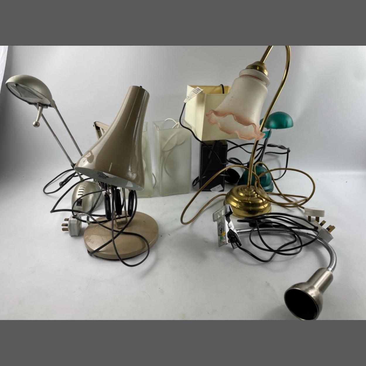 A mixed box of lamps to include AN ANGLEPOISE LAMP 80cm at a stretch, and also a nice brass table lamp with glass shade and much more