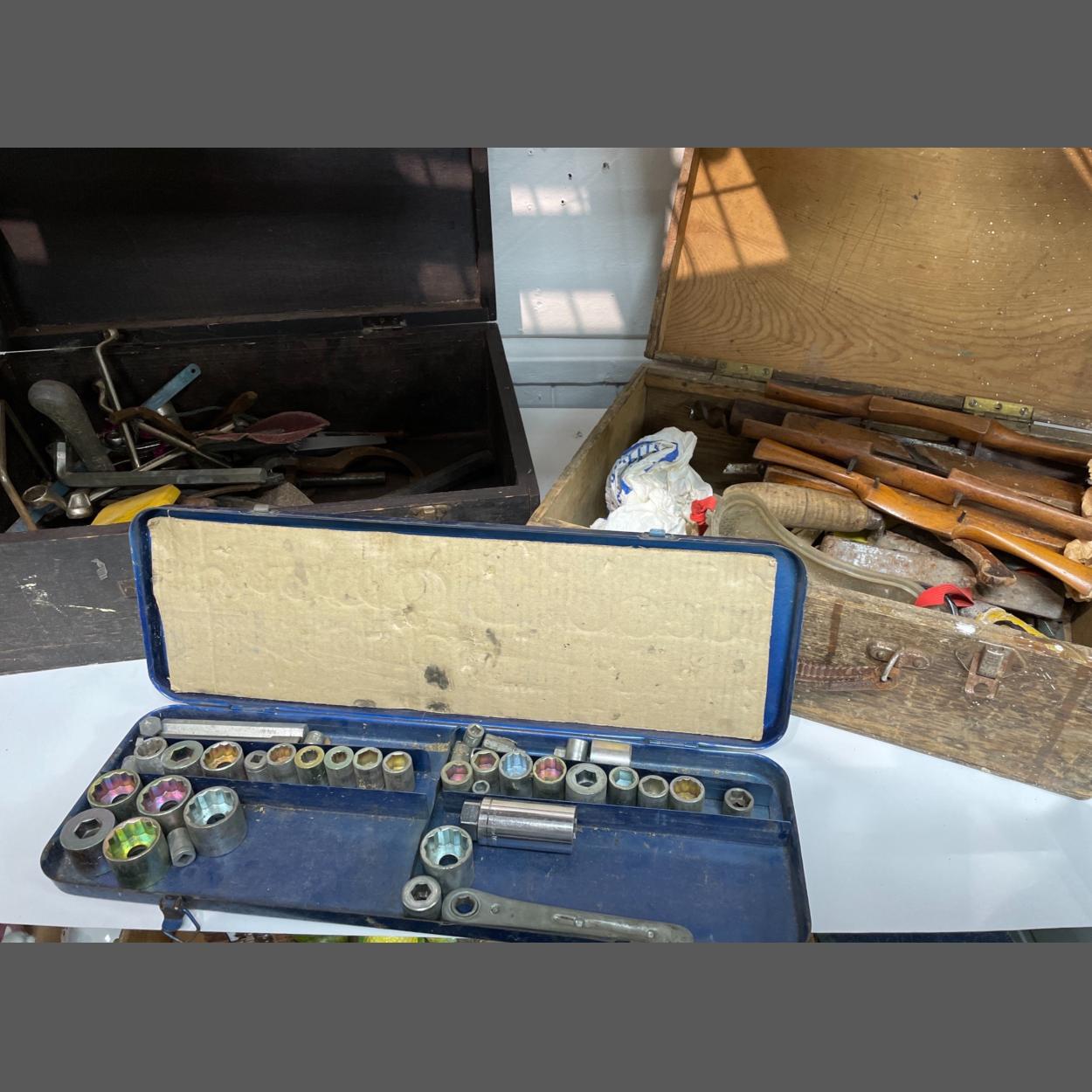 Two medium sized vintage wooden built tool boxes with vintage tools