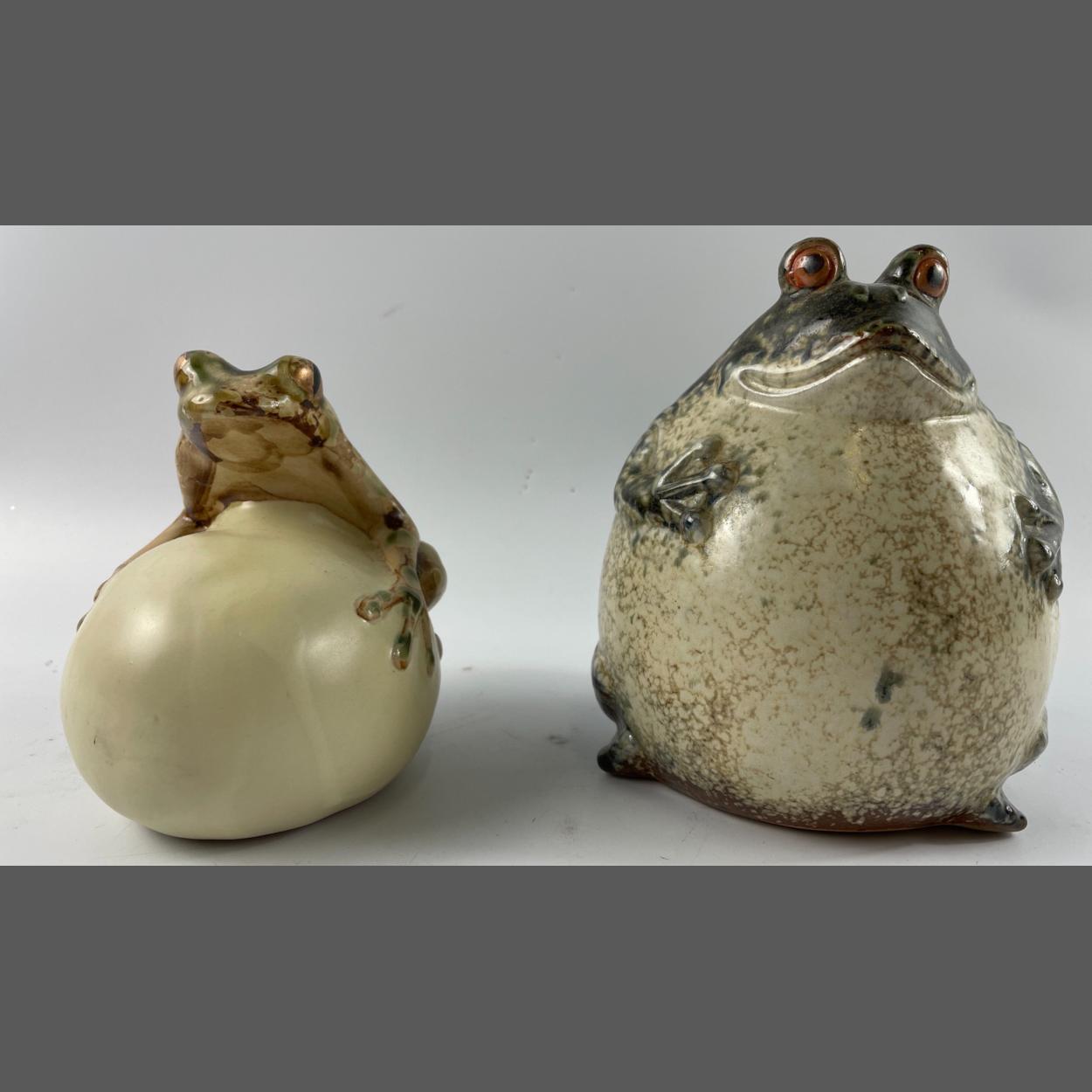 Two characterful FROGS -1 resting on an egg (13cm) and 1 standing 16cm tall.
