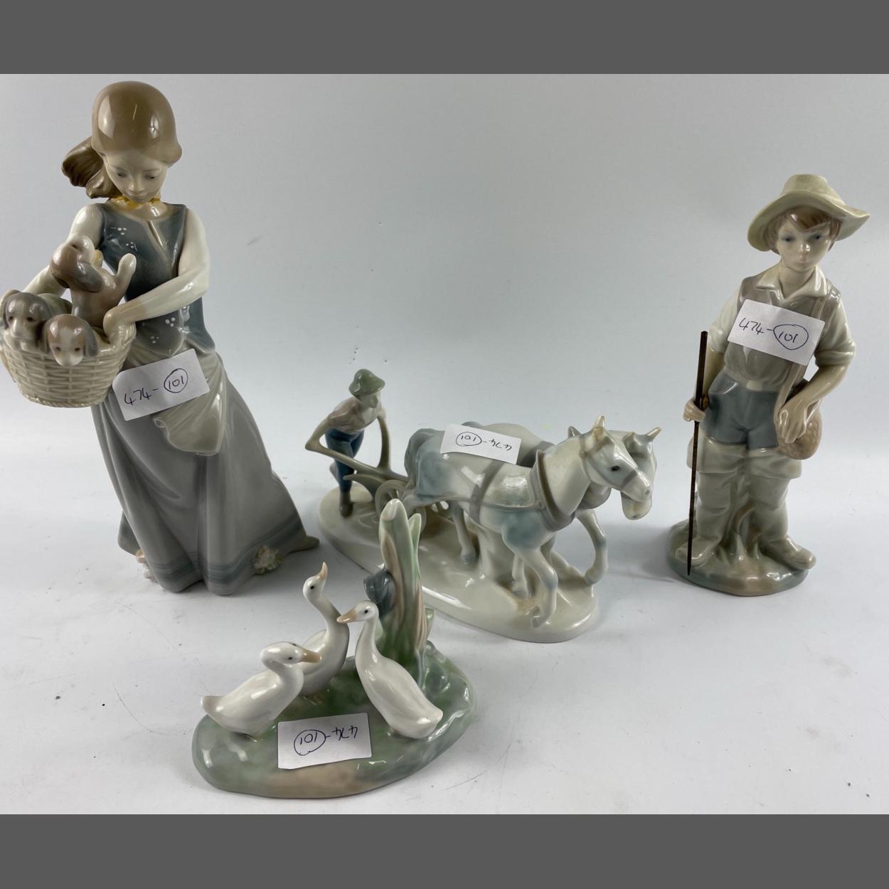 LLADRO FIGURINES to include a boy (approx 23cm) STILL WITH ORIGINAL FISHING ROD, a LLADRO NAO group of geese (12cm high), a young girl with a basket of puppies AF (26cm tall) and a Vintage GEROLD group of farmer ploughing with 2 horses (14cm) with 2 very small chips from one horse's ear.