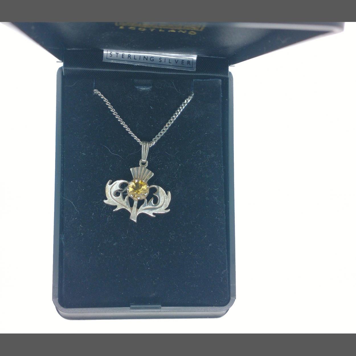 Ortak 925 stamped silver Scottish Thistle pendant and chain. set with a amber central stone.[23cm inclusive of chain ]