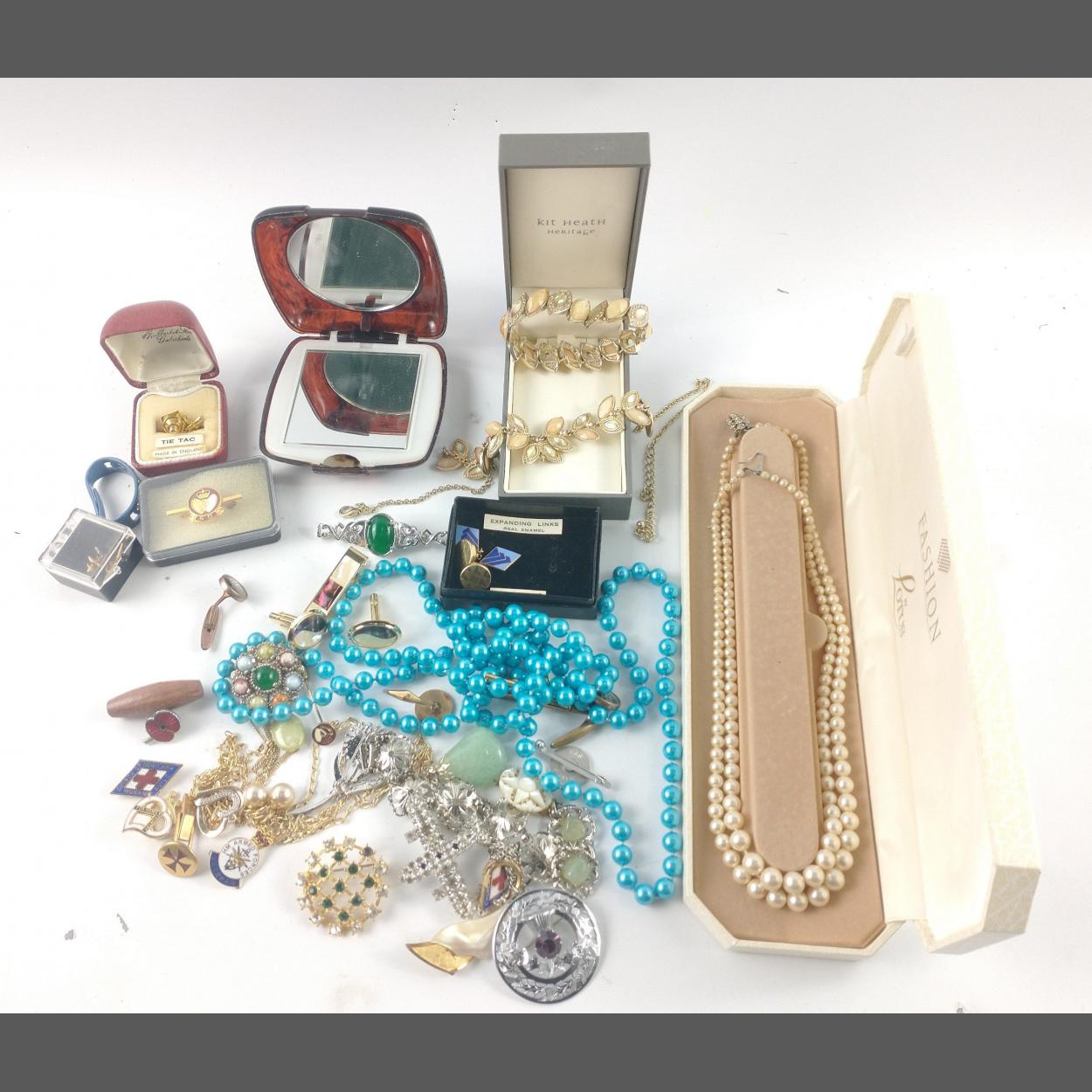 Bag of costume jewellery to include tie clips, necklaces, Lotus fashion pearls, small mirror etc.