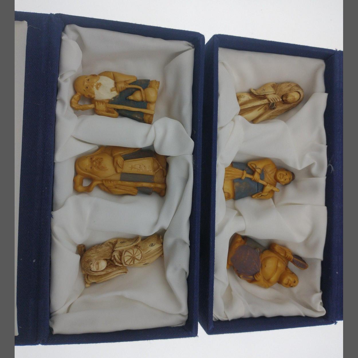 6 NETSUKE style Oriental figures in two padded boxes. [Figures 5cm approx each ]