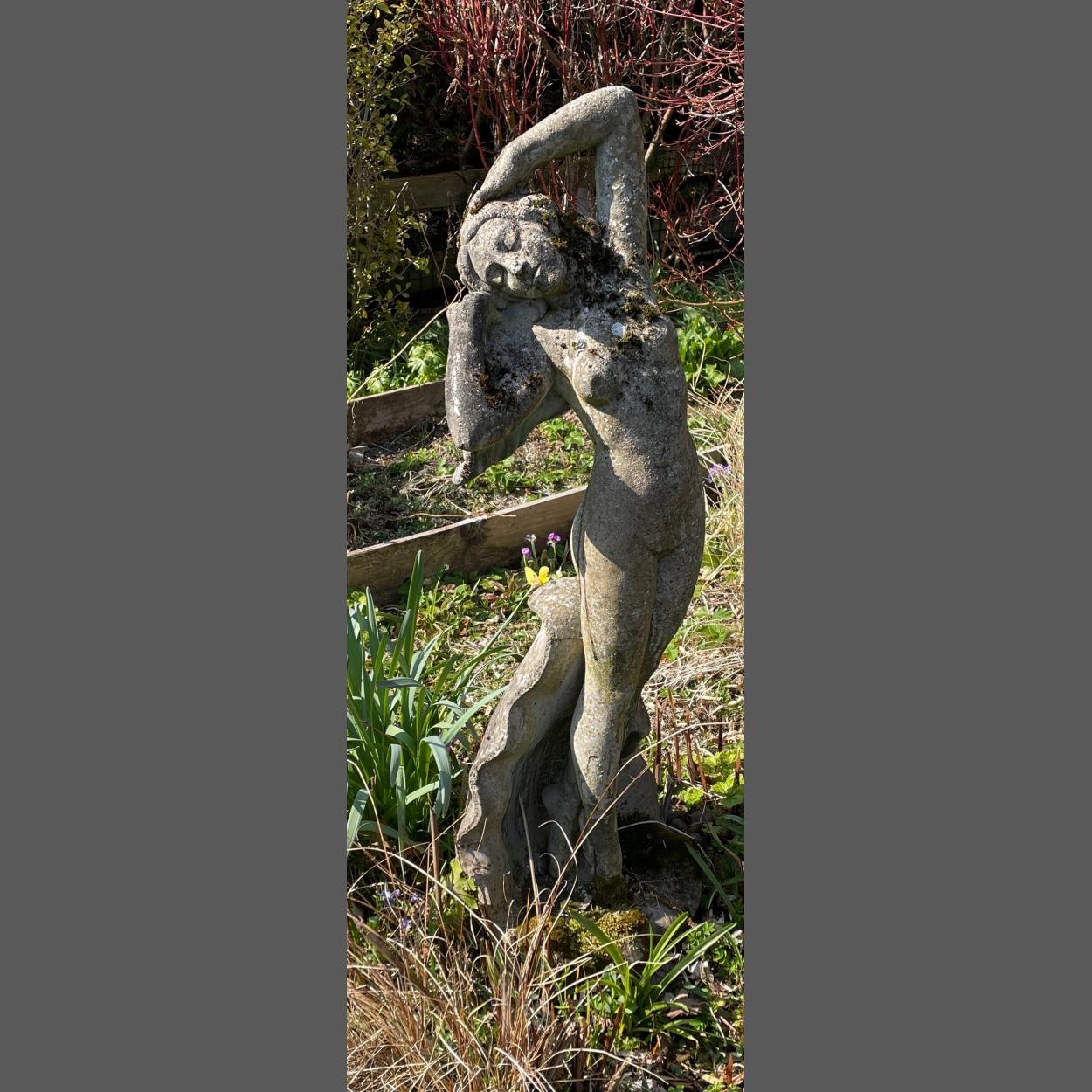 A BEAUTIFUL garden STATUETTE in stone of a young female with a shell like form base height 3.2ft approx