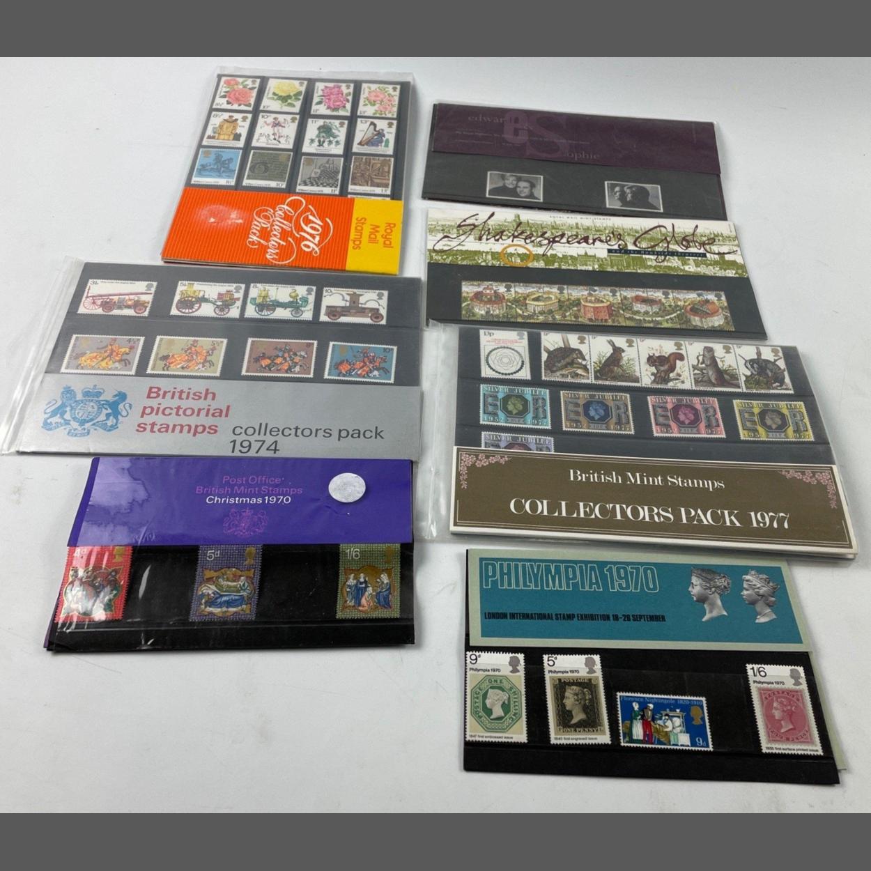 Collection of stamps to include Post Office British Mint Stamps Christmas 1970, Philympia 1970, collectors packs from 1976, 1977, 1974, Royal Wedding of Edward and Sophie and Shakespeares globe