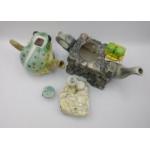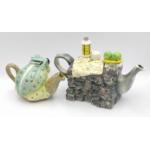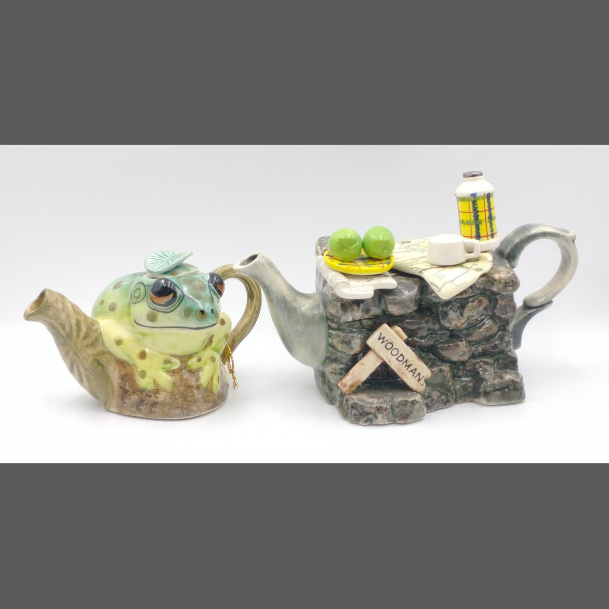 Two unusual small TEAPOTS one of a orienteering picnic scene (15cm long), the other a frog (10cm long)