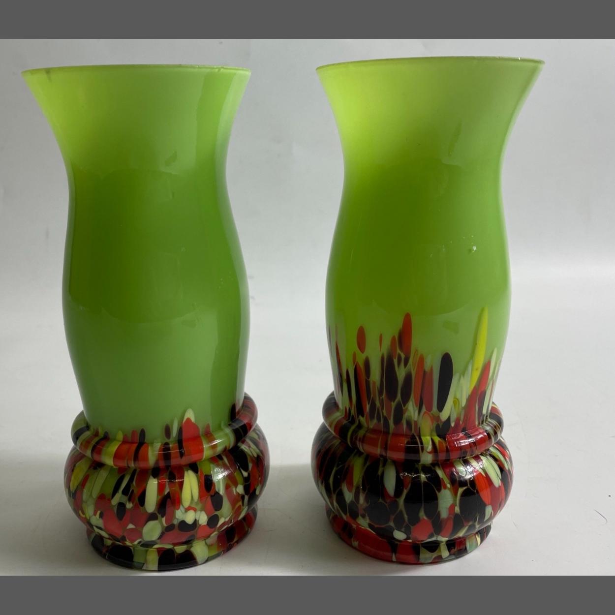 A pair ofVINTAGE GREEN GLASS hand painted flombe vases approx. 18cm high