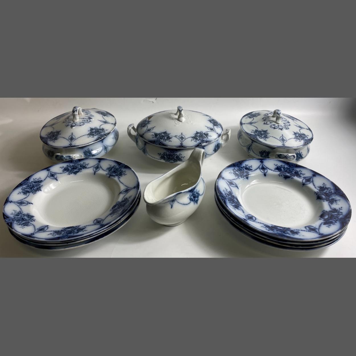 VINTAGE BLUE AND WHITE CROCKERY to include a lidded vegetable dish (23cm) stamped SOHO POTTERY 'IMPERIAL' , a sauceboat and 8 soup plates (24cm dia), one with a chip missing also stamped Soho Pottery Imperial plus other dishes not stamped but the same pattern - 1 lidded vegetable dish and 1 lidded soup tureen with a slight crack.