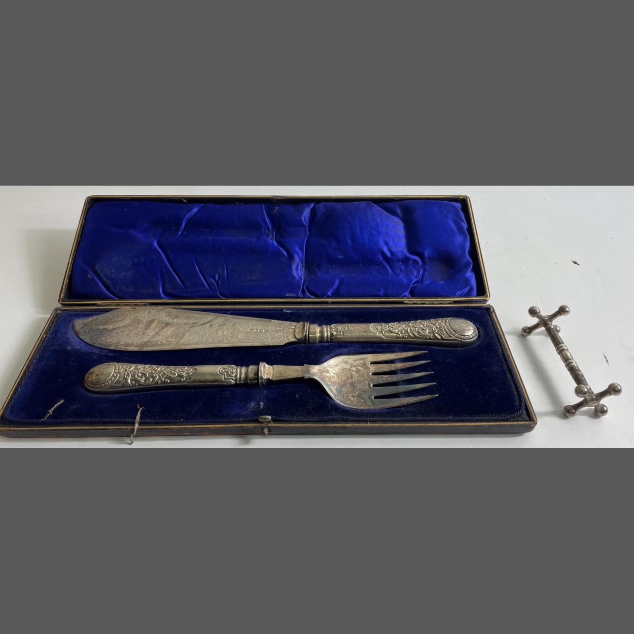 An impressive boxed set of ROBERTS & BELK vintage silver plated SERVING KNIFE AND FORK with cutlery rest.