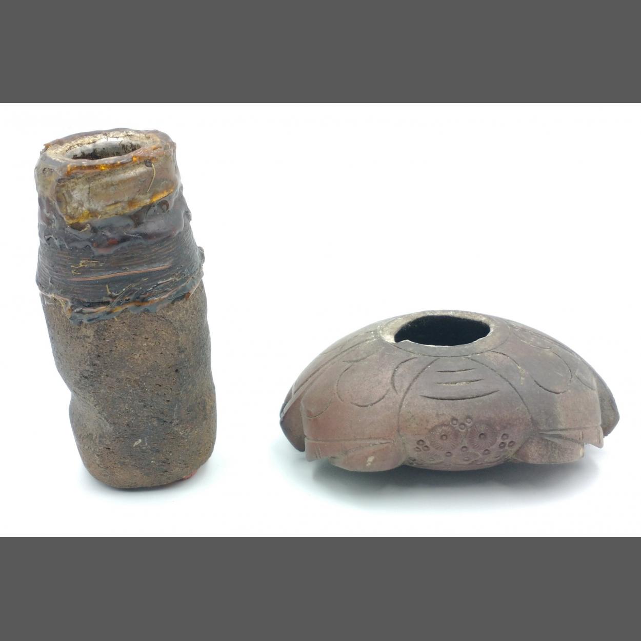 An OPIUM LOT! An antique stoneware opium bowl in carved CRAB FORM, the top part has been broken at some point, but this does not detract from the beauty of this antique object! Dimensions 8cm length x 5.5cm wide x 3.5cm height approx with one other antique clay style pipe end concealing part of a wax stamp on the base, dimensions 8cm length x 3.5cm girth approx.