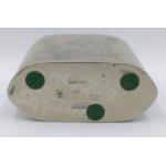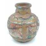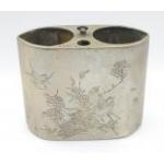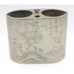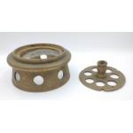 AN OPIUM LOT! An ANTIQUE highly decorative ceramic opium pipe head in crackle-glaze with brass and copper fittings dimensions 8.5cm tall x 7.5cm diameter at widest point, some opium accessories with a brass pipe holder? diameter 9cm x 5cm high approx, and another form of holder with decorated flora, fauna and wild birds dimensions 6.5cm high x 8cm long, with CHINESE stamps to the base.