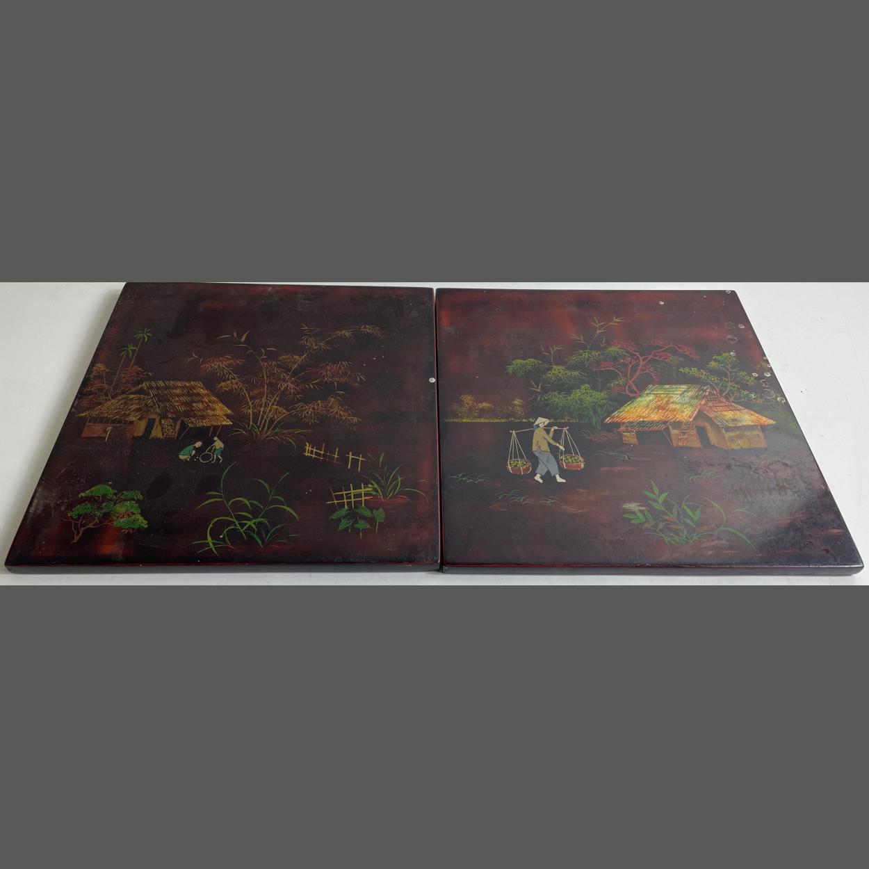 Two vintage wall plaques of painted Oriental countryside scenes 25 x 25cm.