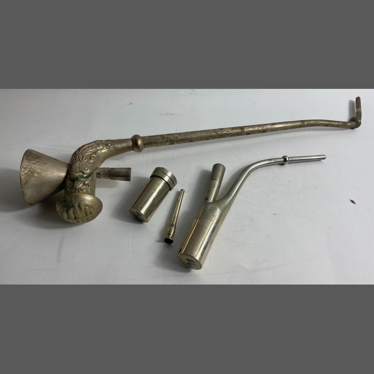 An OPIUM LOT! A large CHINESE OPIUM pipe with attached stand decorated with dragons either side and with flora and fauna decor on the pipe stem, dimensions 56cm tall when standing, a white metal opium lidded box dimension 7cm tall x 3.5cm width with also a smaller white metal opium pipe 25cm high approx