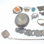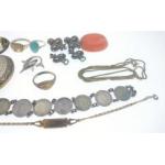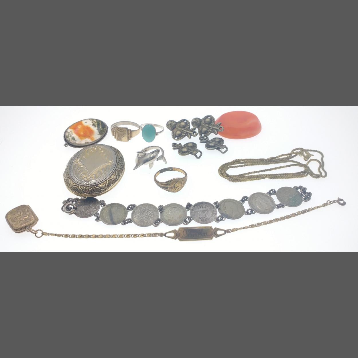 Mixed lot to include 3 rings, oval metal locket, brooch and a silver three pence bracelet [15.3grm] etc