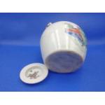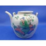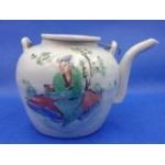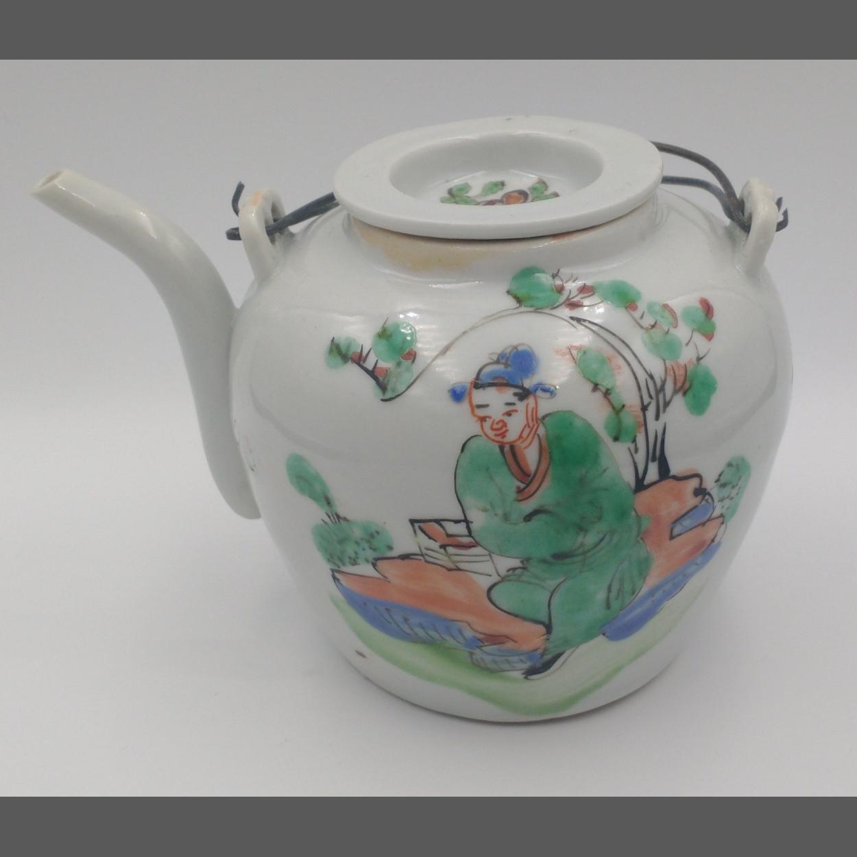 An EXQUISITE CHINESE small ceramic teapot including lid with hand painted traditional scenes and 'wire-work' handle 9cm high x 13cm diameter at widest point