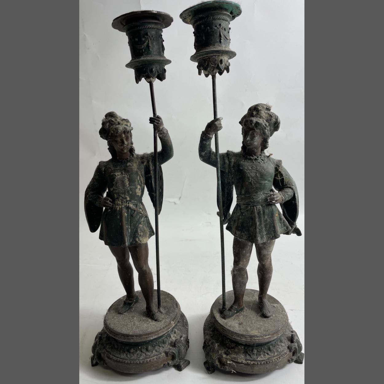 One pair of VINTAGE copper alloy candlesticks borne by figures ressembling 15th century Italian pages, some green paint still remaining on tunics, standing (approx 35cm high)