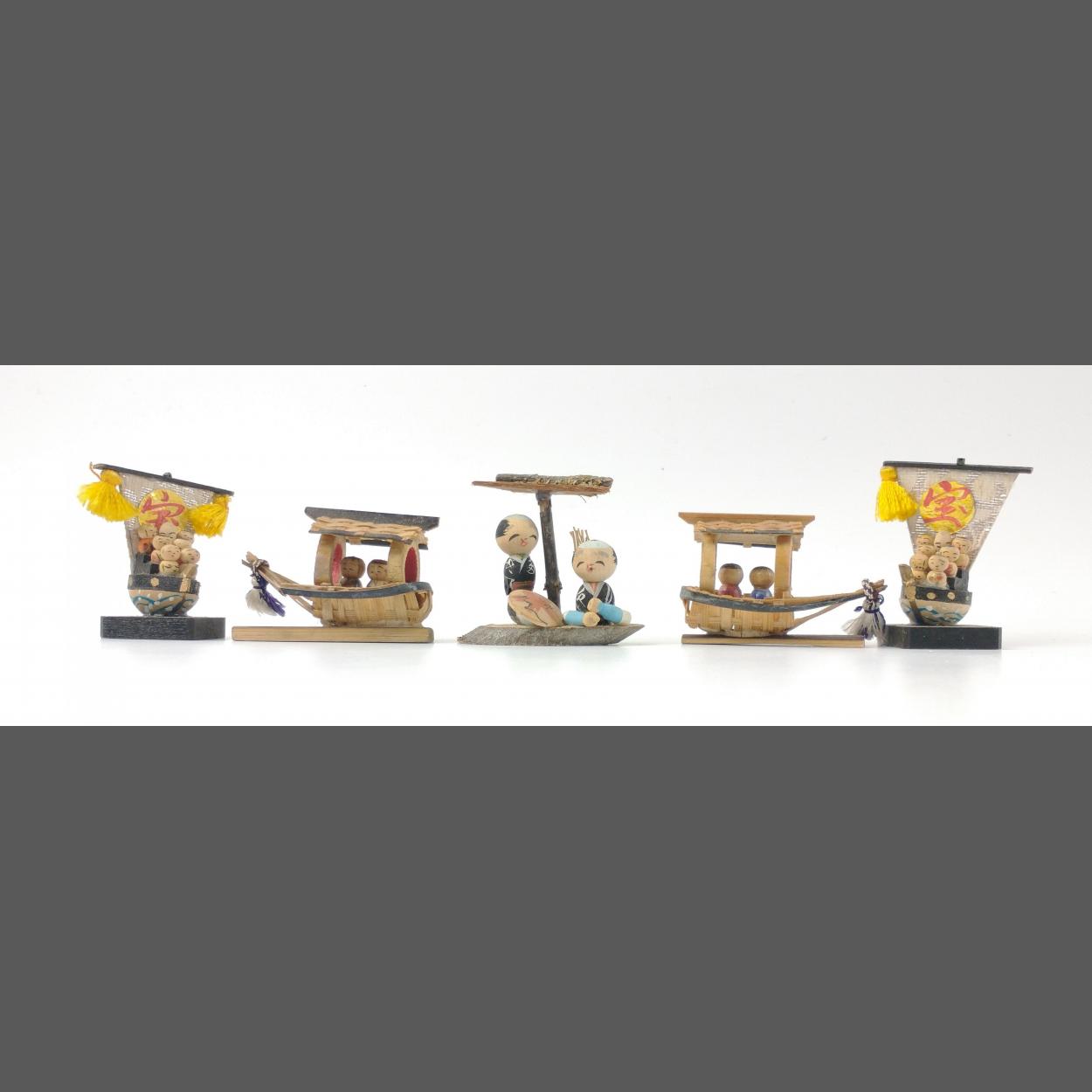 TINY CHINESE MODELS mainly of people on a boat, none taller than 4cm.