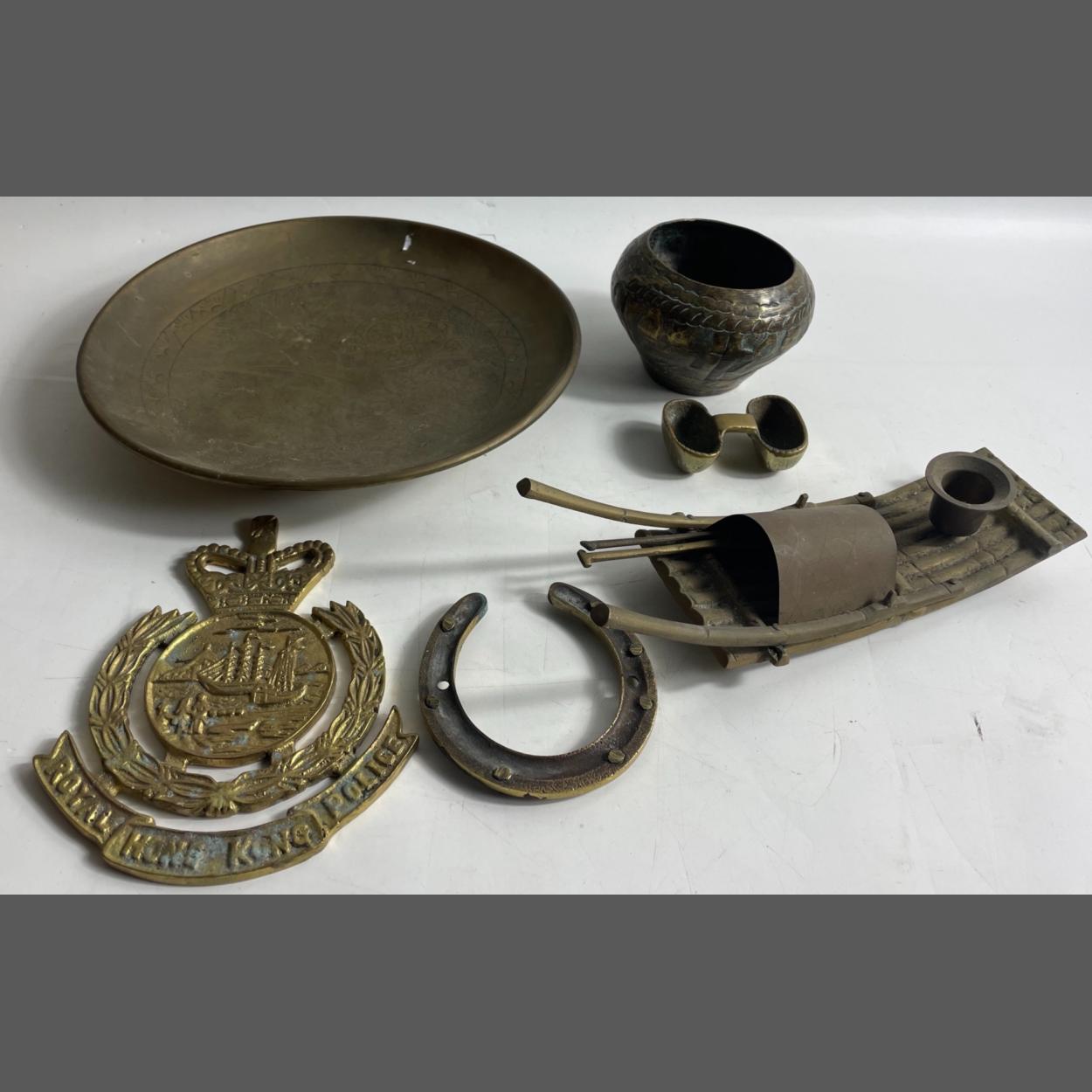 ORIENTAL ANTIQUE BRASS collection to include a STUNNING ROYAL HONG KONG POLICE badge [17×14 cm], hanging wall plate [D:26cm], sledge/boat candle holder [L:25cm], small bowl [8×12cm] etc