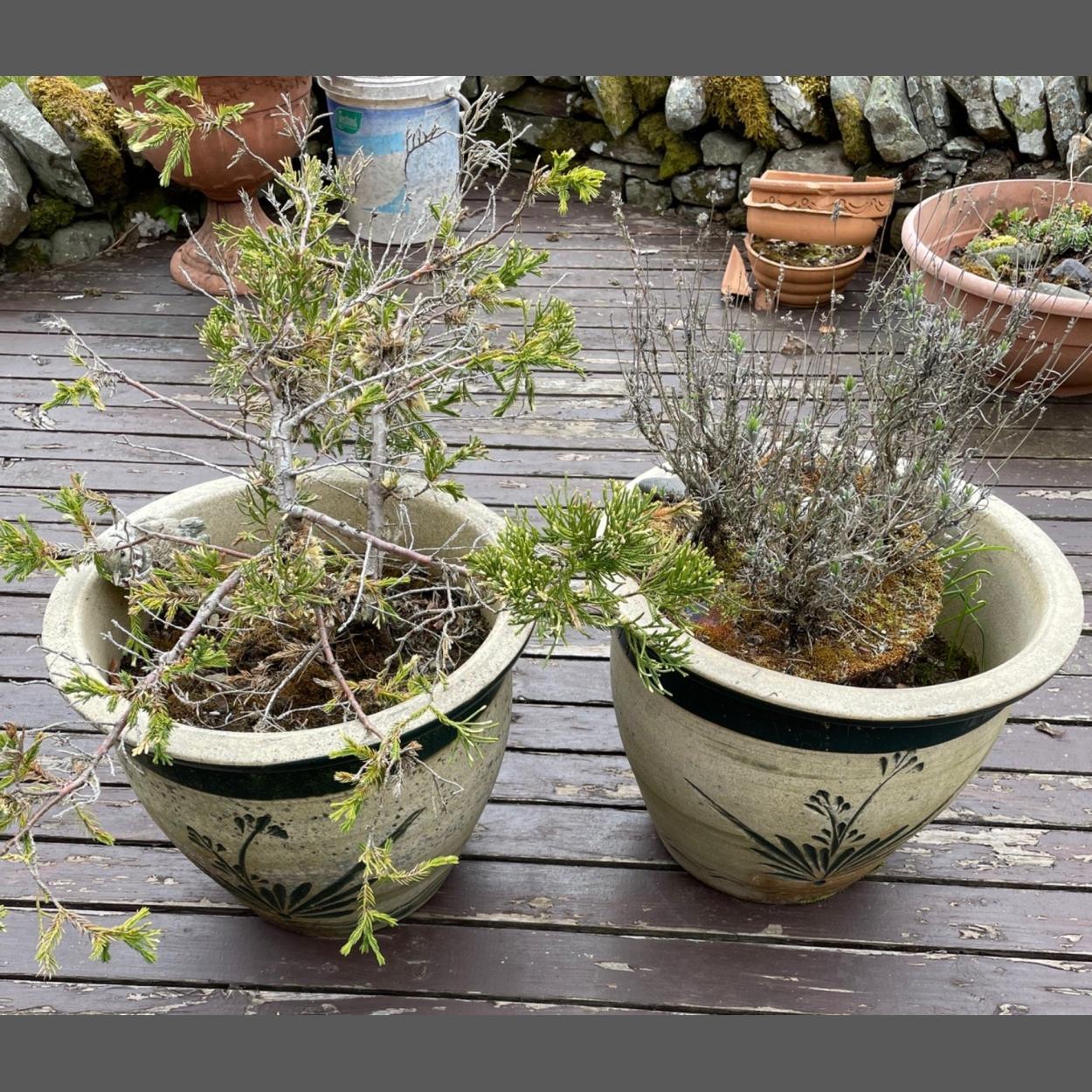 A pair of ceramic garden containers to include planting 30cm height each x 38cm diameter