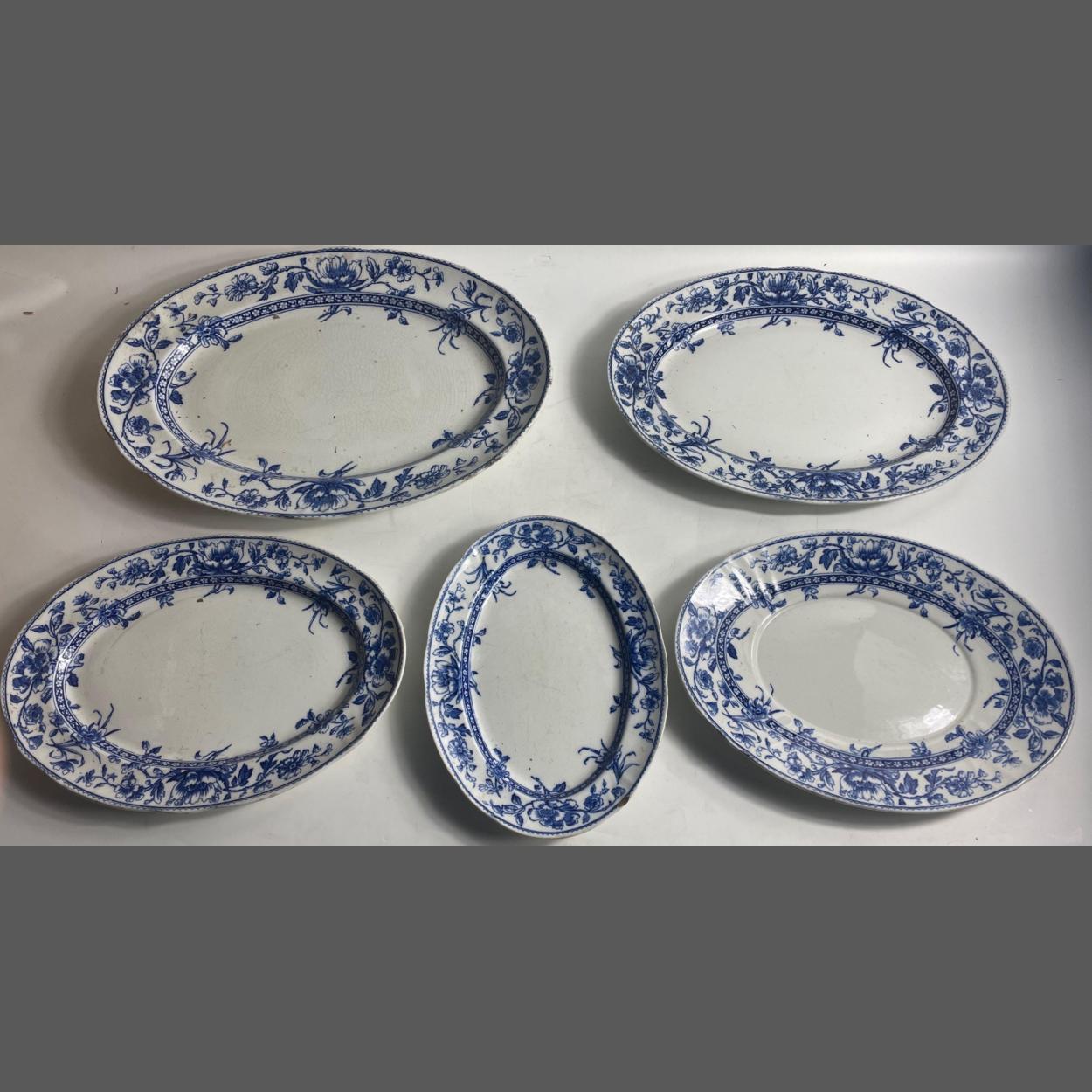 Five VINTAGE OXFORD blue and white ashets ranging in size from 30 to 46cm approx.