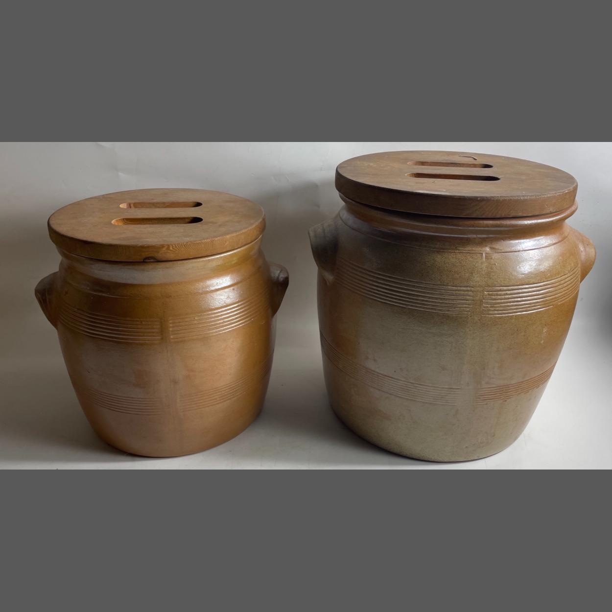 Two HUGE! GLAZED EARTHENWARE POTS with lids standing 28 and 33cm tall.