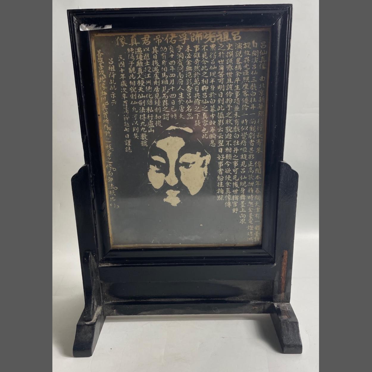 An ORIENTAL screen print style framed within a small table-top stand 44cm high x 31cm across approx - you are seeing it as we found it!