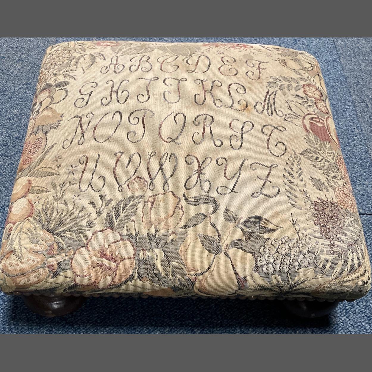 An old UPHOLSTERED FOOTSTOOL on bun feet approx 38cm with a design of the alphabet.