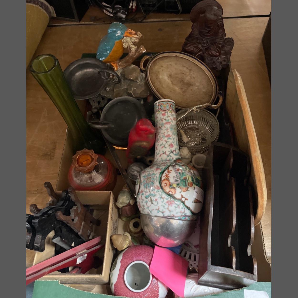 GOOD QUALITY ITEMS! A VERY MIXED BOX OF DECORATIVE ITEMS including a nice wooden letter rack, a pretty CHINESE VASE, a MERMAID 10 oz ladle, Oriental wood carving with small crack and missing piece, a collectable ALABASTER egg and much more..