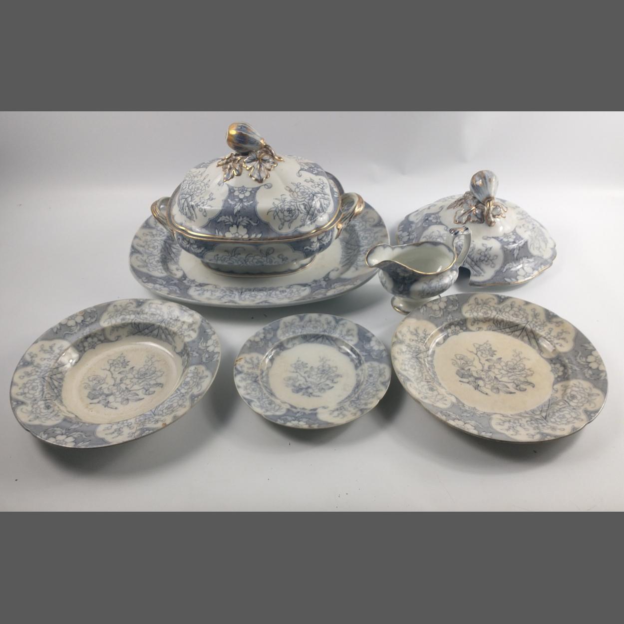 A small collection of ANTIQUE SIVA WARE to include a most impressive lidded vegetable dish standing approx 25cm high, a super sized ashet approx 45cm long, a sauce boat, soup, side and dinner plate. Condition is commensurate with their antiquity and would make a wonderful dining room display.