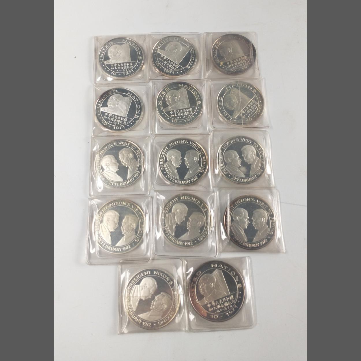 14 qty 1972 UNITED NATIONS/PRESIDENT NIXON'S VISIT TO PEKING SILVER MEDALS GOOD CONDITION all kept within plastic sleeves .