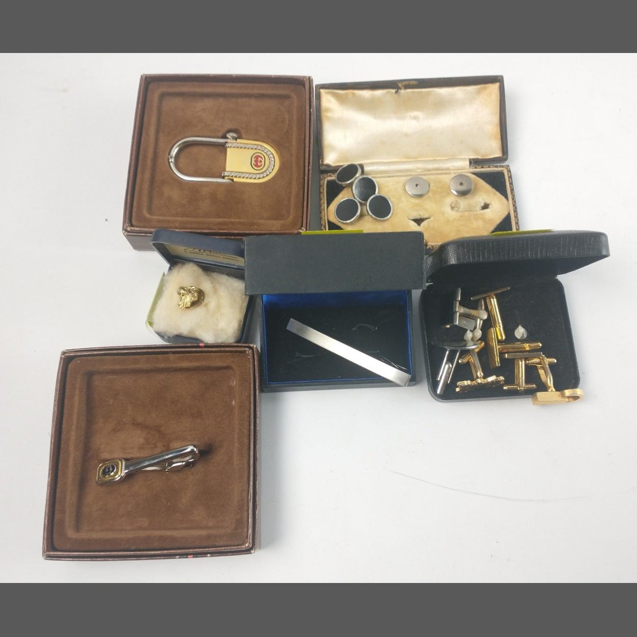 A collection of gents' jewellery items to include some white metal and black stone style cufflink set, a Two GUCCI accessory boxed items, boxed tie-pin, some yellow metal cufflinks etc