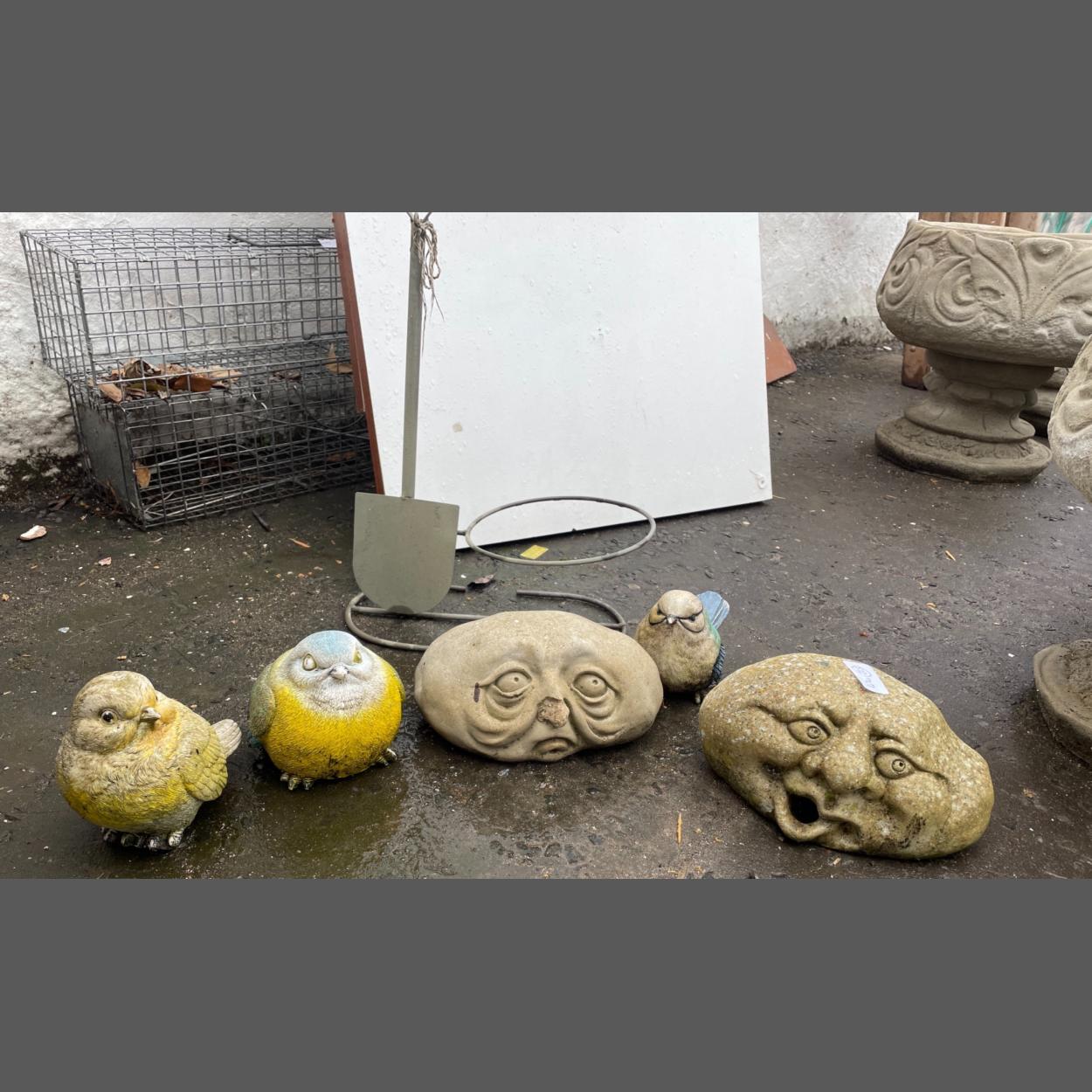 A collection of GARDEN ORNAMENTS to include two stoneware goblin faced creatures 2/cm long approx three resin birds and also a spade garden pot stand 18” tall
