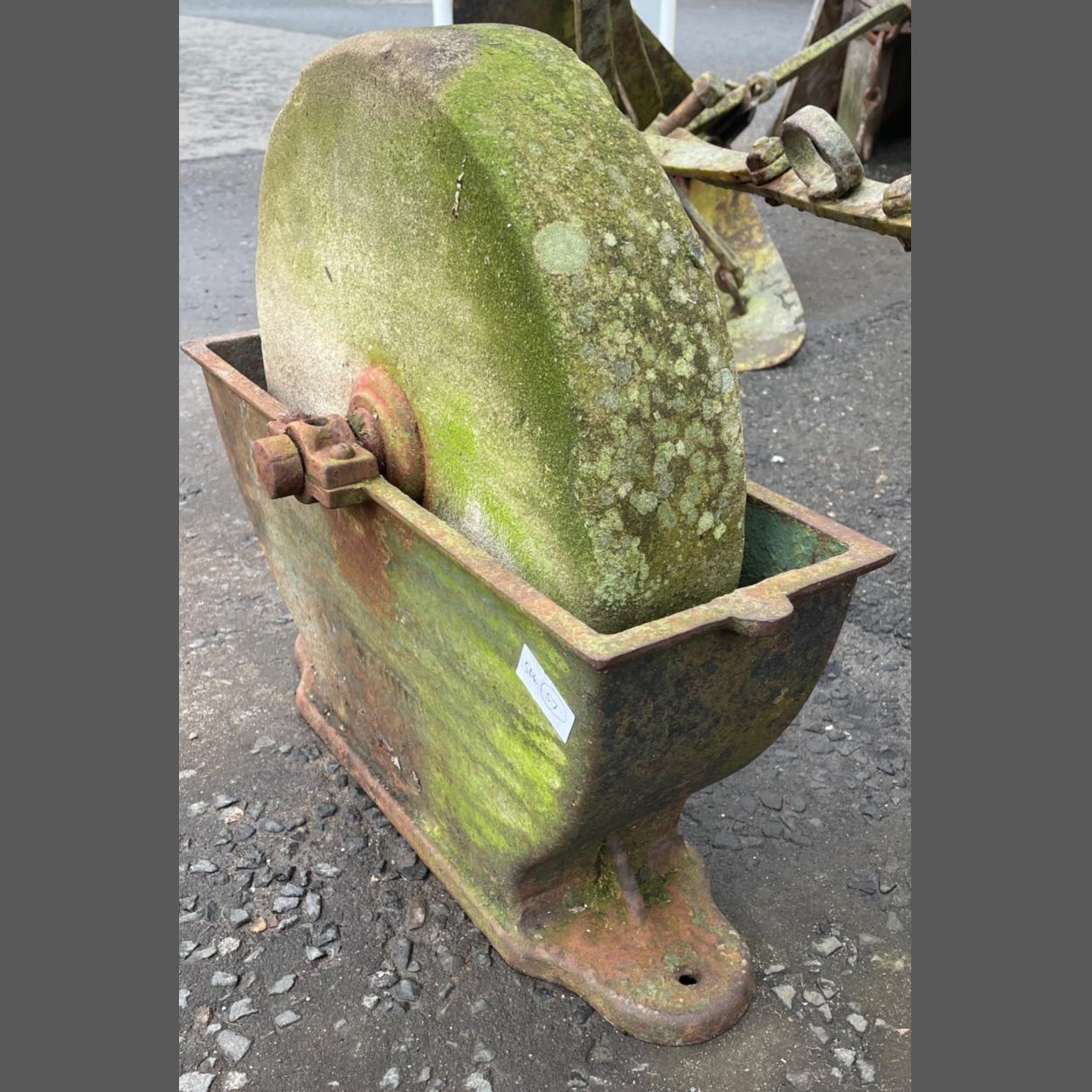 A VICTORIAN SANDSTONE WHEEL MOUNTED KNIFE SHARPENER - this would make a nice garden feature! 18” long x 18” high approx