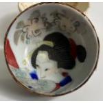 An interesting 'TINY' lot to include a miniature PIRATE TOBY JUG by THORLEY's, 4cm height, 4cm diameter, a small ORIENTAL hand painted porcelain bowl in (outer bowl surface in basket form), 6cm diameter x 2.5cm height, and lastly an ANTIQUE small cream coloured ceramic bowl with small children playing , a couple of tiny chips out of the outer rim, 6.5cm diameter x 3cm height