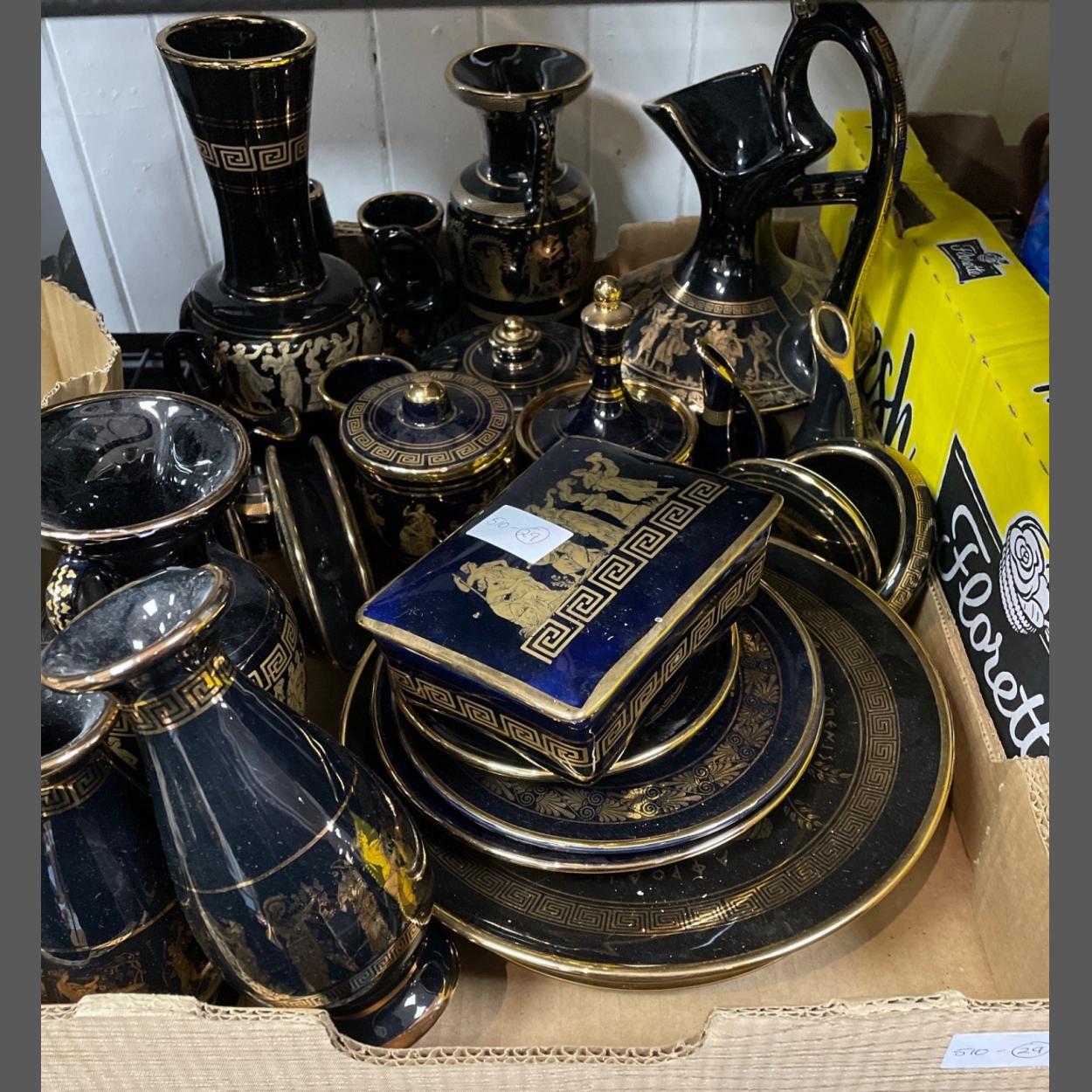 When doesn't black and gold look well together? No problem with this impressive collection from GREECE of decorative items illustrating places and people of legend including vases, wall plates, lidded trinket boxes etc. 29 items in total with only a couple of chips to the rim of two vases.