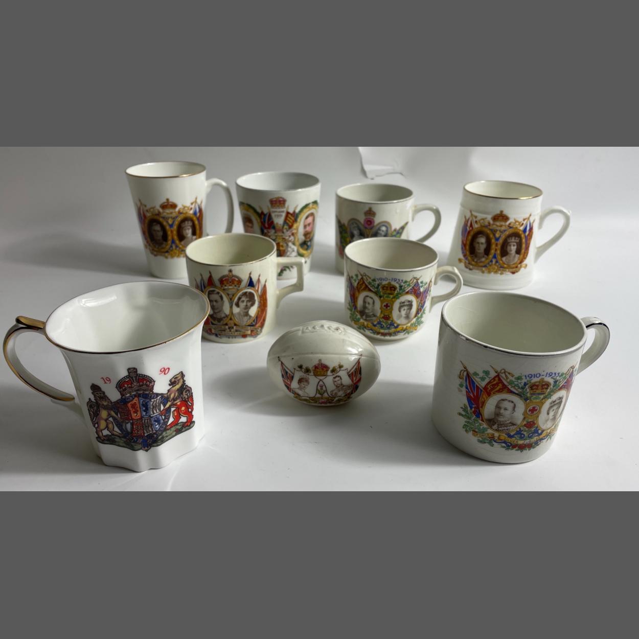 An unusual COMMEMORATIVE RUGBY BALL (7cm long approx) to commemorate the CORONATION OF GEORGE V, plus a commemorative teapot with EDWARD Vll and QUEEN ALEXANDRA plus seven ROYAL COMMEMORATIVE mugs and beakers to include King George V Malingware from the city and county of Newcastle-Upon-Tyne.