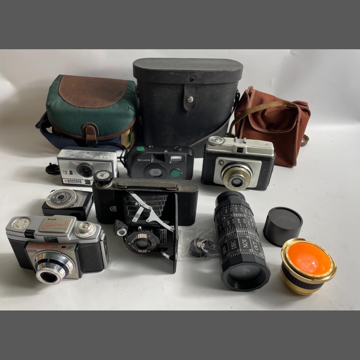 A collection of vintage CAMERAS AND LENSES to include a KODAK COLORSNAP 35 with case, ILFORD SPORTI with case, a FUJIFILM SMART SHOT, an INSTAMATIC 50 (with film!), plus a PANORAMA NIGHT VISION super wide angle lens and a LENINGRAD 4 LIGHT METER and a stellarscope etc