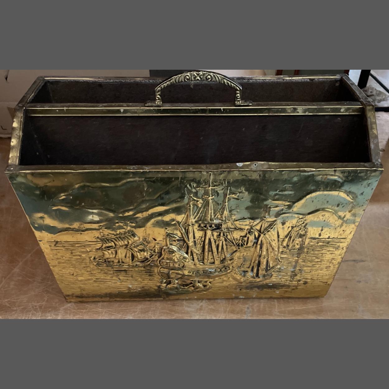 A SUBSTANTIAL FIRESIDE MAGAZINE RACK made of repousse brass over wood with a nautical scene stands approx 28cm high.