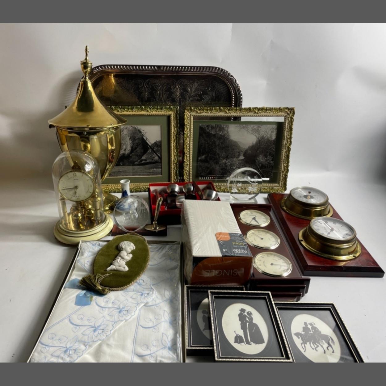 A QUALITY very mixed box to include embroidered pillowcases, single bed sheet (unopened), wall barometer, vases, mantlepiece pendulum clock etc etc