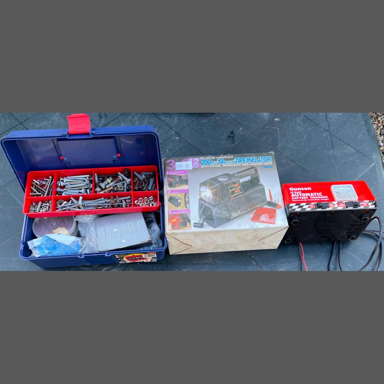 Collection of tools to include an electric battery charger also a 3 in 1 tyre inflator still in its box also a small tool box with an assortment of bolts and drill bits etc