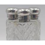 Nice collection to include set of 4 hallmarked London 1893 silver topped corner perfume bottles (8cm tall approx), marked with Hamilton & co Calcutta with maker mark GB, 925 marked with 1986? Birmingham import mark and 2 white metal condiment spoons