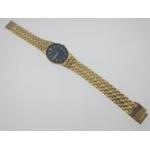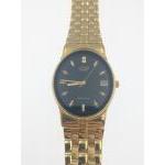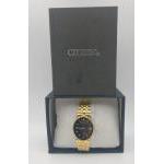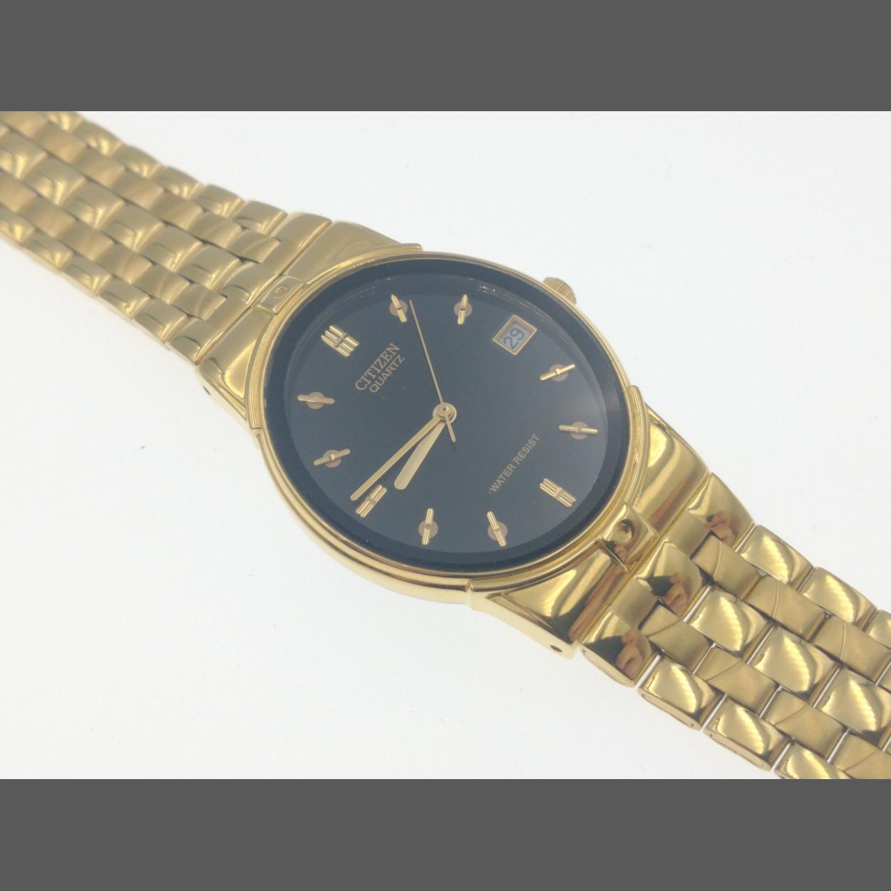 Ladies gold coloured CITIZEN wrist watch with date dial and black face. Needs new battery. Oval dial 3cm by 2.8cm approx, bracelet approx 19cm long.