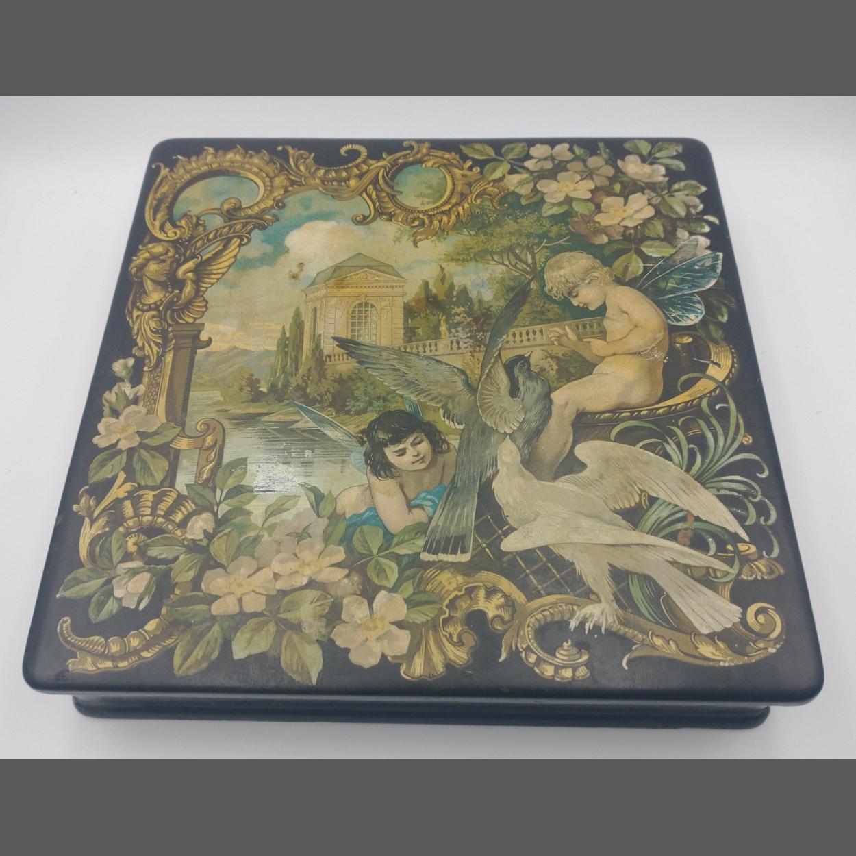Square box with Victorian style transfer of children with blue transparent wings by lake house. Interior with vibrant orange colour