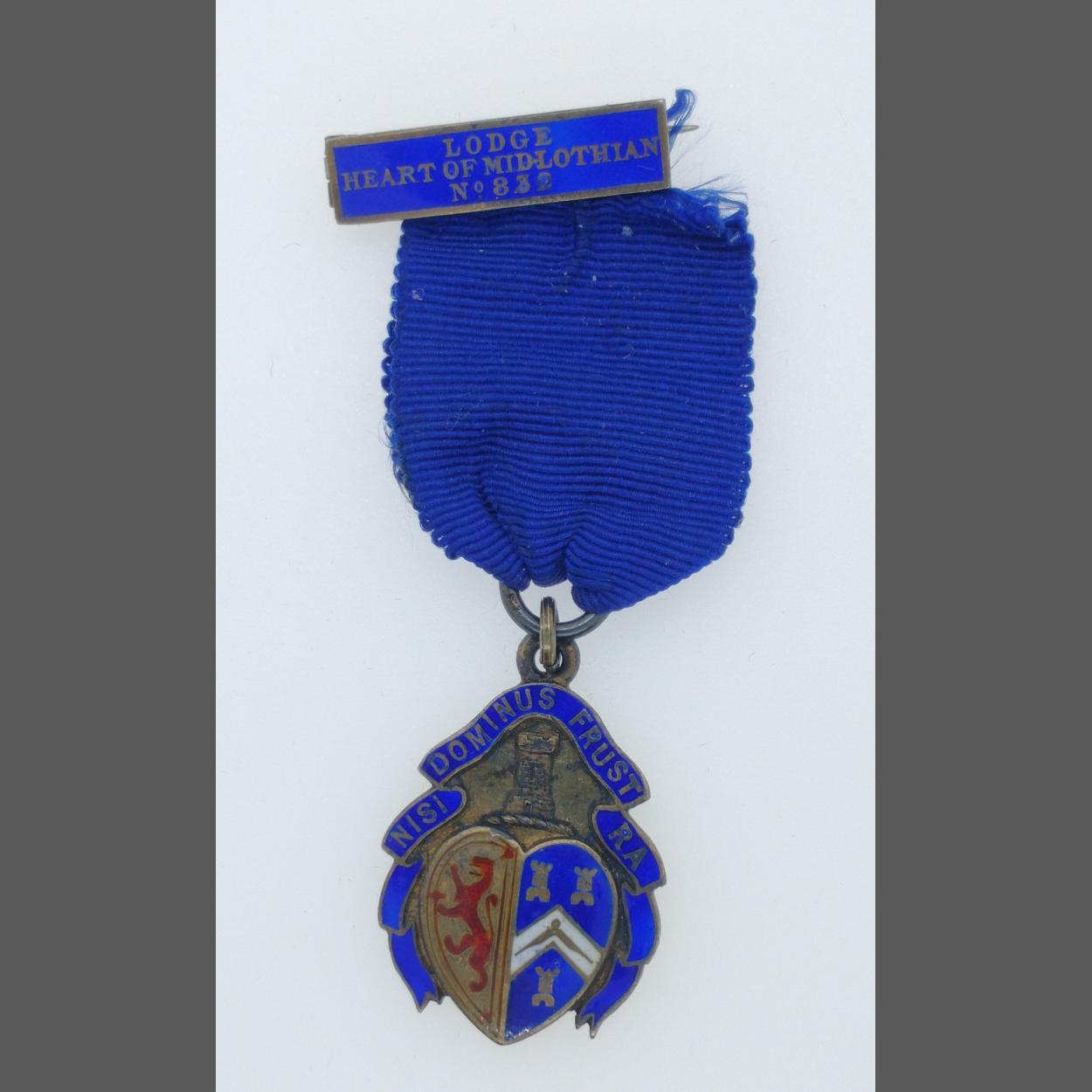 MASONIC INTEREST, Lodge 'Heart of Midlothian No 832' pin medal with blue ribbon. Medallion with Birmingham 1909 hallmark with enamel front stating 'NISI DOMINUS FRUST RA' with 3 castles over open compass. Comes in jewellery case