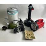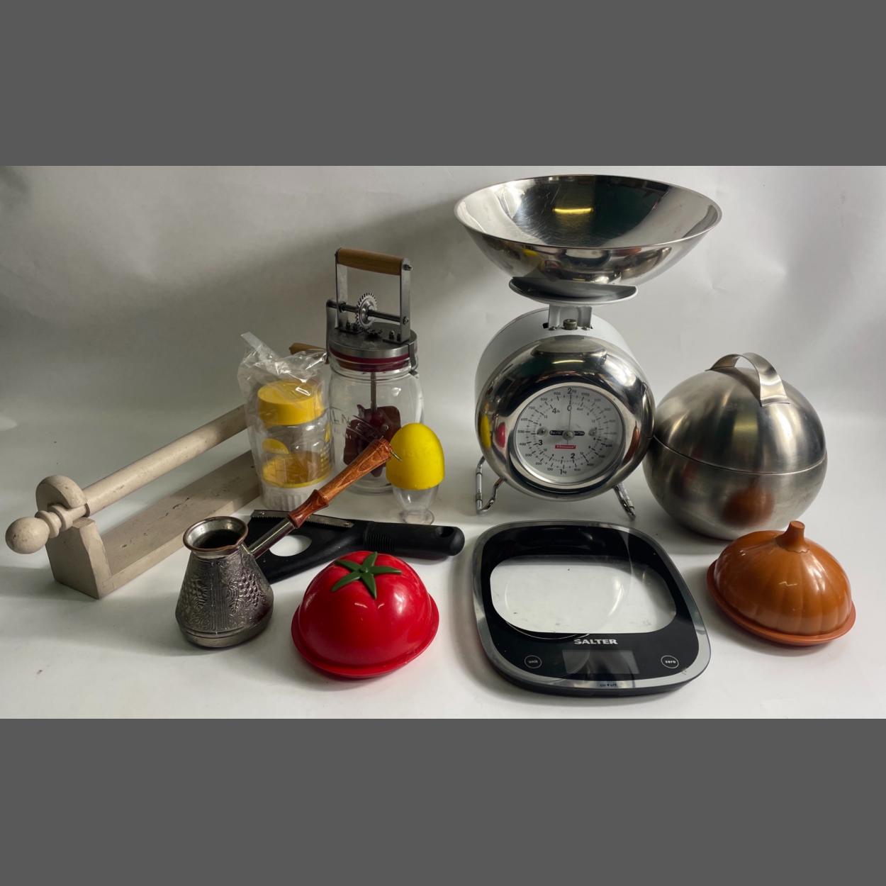A large mixed box of kitchen items to include a yoghurt maker, a glass butter churn digital scales etc
